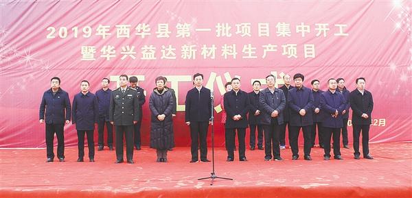 本报讯(记者 张猛)2月26日上午,西华县2019年第一批项目集中开工仪式在华兴益达新材料生产项目建设工地举行。县领导林鸿嘉、田庆杰、周晓燕、郭峰、胡军华、李涛、郝清俊、王献超、张晓伟、杨凤臣、王卫东及其他县处级领导干部出席开工仪式,各乡镇办及县直各部门主要负责同志、各项目施工单位代表参加开工仪式。