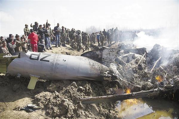 2月27日,在印控克什米尔地区,人们聚集在战机残骸旁。巴基斯坦三军新闻局27日说,巴空军当天清晨在巴基斯坦领空击落两架印度空军战机。新华社发