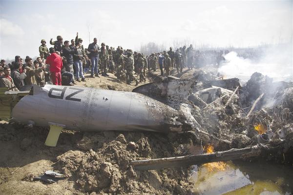 2月27日,在印控克什米尔地区夏季首府斯利那加附近,人们聚集在战机残骸旁。