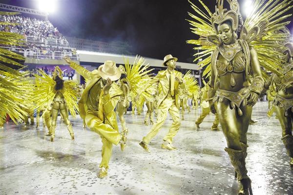 3月3日,在巴西里约热内卢,特级组桑巴舞校演员参加狂欢节游行。
