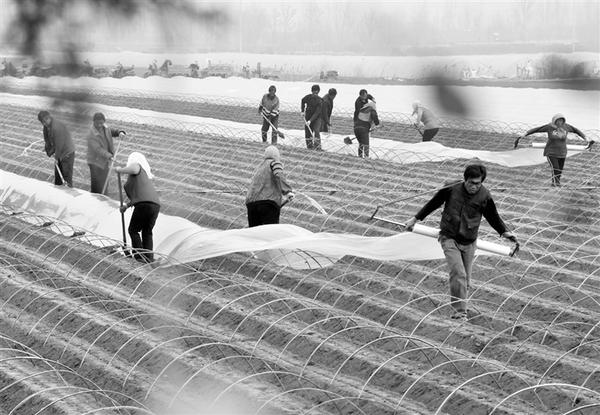 3月5日,山东省莱西市夏格庄镇西曲格庄村村民在为刚播种的胡萝卜覆膜。近日,齐鲁大地气温渐暖,大部分地区都进入春耕农忙季节,田间地头一片繁忙的景象。新华社记者 李紫恒 摄