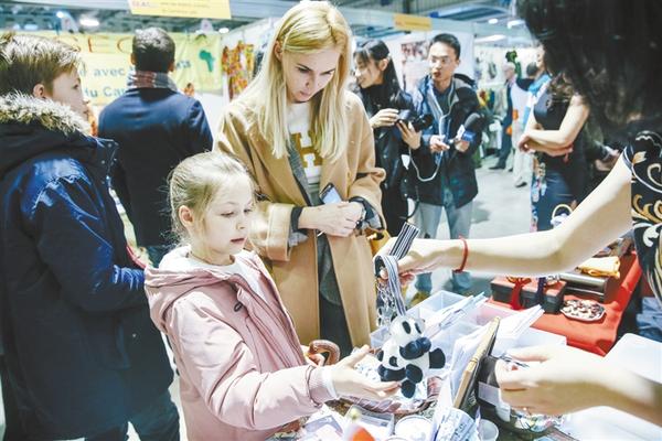 3月3日,观众在卢森堡移民文化节中国展台购买熊猫配饰。