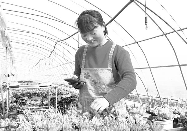 3月6日,扶沟县大新镇洼刘村村民郭丽君正在通过网络向客户介绍多肉植物。 三年前,郭丽君返乡创业,靠种植多肉植物实现了致富梦。目前,郭丽君在大新镇的3个大棚里有200多个品种,产品销售到全国各地,年销售额20多万元。 卢付昌 摄