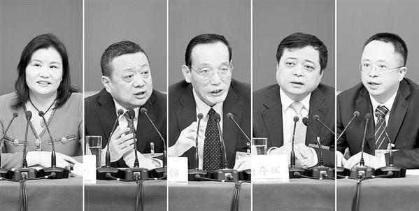 本栏文图均据新华社电 3月6日,全国政协十三届二次会议新闻中心举行记者会,邀请全国政协委员刘世锦(中)、南存辉(右二)、叶青(左二)、周鸿祎(右一)、周群飞(左一)谈优化营商环境、促进民营经济高质量发展(拼版照片)。