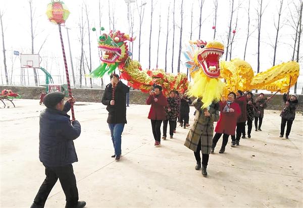 近日,县直机关工委在所驻村鲁台镇毛庄村成立了夕阳红舞蹈队,并为舞蹈队购置了舞龙、舞狮所需道具。图为舞蹈队正在排练“双龙戏珠”节目。