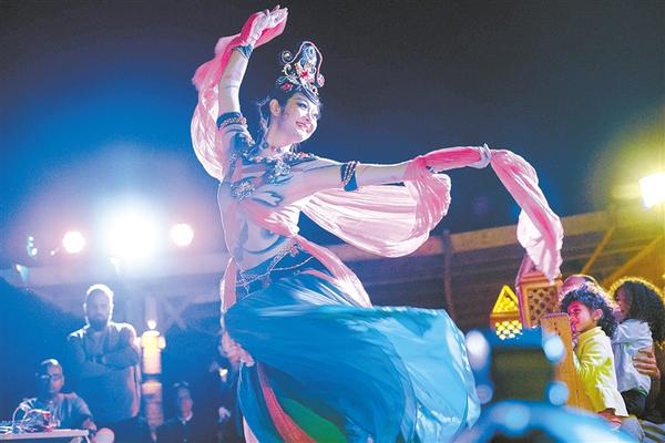 3月6日,在埃及沙姆沙伊赫,中国文艺表演者在表演舞蹈。6日晚,首届沙姆沙伊赫亚洲国际电影节迎来主宾国中国的文艺演出,9名中国文艺表演者用舞蹈、音乐和歌声展现了中国文化的独特性与包容性。新华社记者 邬惠我 摄
