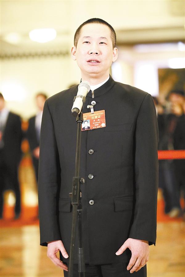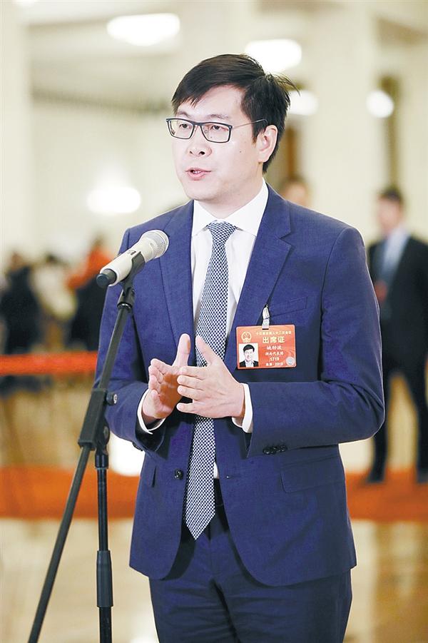 3月8日,十三届全国人大二次会议在北京人民大会堂举行第二次全体会议。这是全国人大代表罗鹏在“代表通道”接受采访。