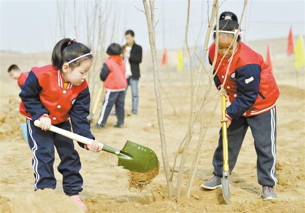 3月11日,两名小学生正在为树苗培土。植树节前夕,一小学组织学生开展植树活动,为大自然增添绿色。牟宇 摄
