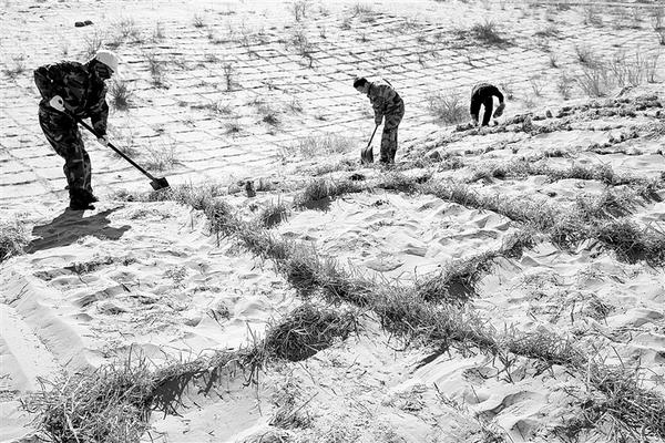 3月12日,人们在荒漠中用麦草制作阻沙网。