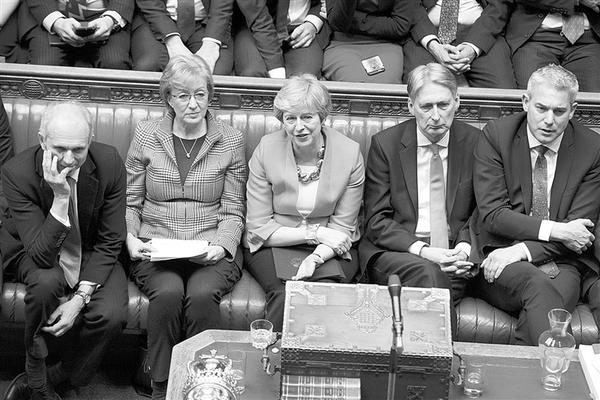 3月12日,在英国伦敦,英国首相特雷莎·梅(中)出席议会下院投票。