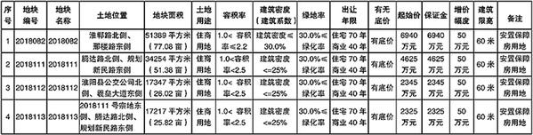 备注:①具体建设方案须报规划部门批准后实施,土地出让合同签订后,12个月内必须开工建设,工期30个月,土地成交价款需在土地出让合同签订后60日内缴清,交地时间6个月内。②2018082、2018111、2018112、2018113号宗地用地性质:二类居住用地(R2)(安置保障房用地)。③2018082号宗地可兼容商业建筑面积比例不大于15%;2018111、2018112、2018113号宗地兼容商业的建筑面积不得超过项目总建筑面积的20%。④海绵城市规划要求:2018082号宗地下沉式绿地率不低于60%,透水铺装率不低于80%;2018111、2018112、2018113号宗地下沉式绿地率不低于60%,透水铺装率不低于40%;具体以规划部门出具的规划指标为准,详见《规划条件通知书》。