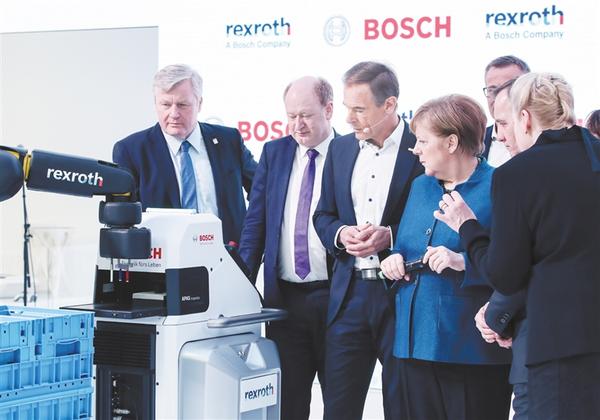 4月1日,在德国汉诺威,德国总理默克尔(左四)参观博世力士乐公司展区。