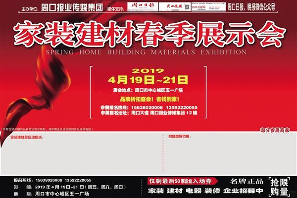 周口报业传媒集团拟携手各家装、建材、电器等商家协办周口家装建材春季展示会。目的:倡导低碳环保、健康生活理念,推动住宅装饰装修行业健康发展,提高人们对装修装饰水平的认识,品味精致人生;激发消费者热情,增进消费者对家装建材的了解。此次展销会,周口报业传媒集团将利用多种宣传方式汇聚高人气,通过和报业集团主办的大型春季房展会同时举办,让周口家装建材企业走近房企、进入家庭,给各家装、建材企业起到一个很好的宣传作用,提高知名度,打响品牌。