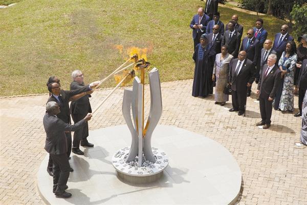4月7日,在卢旺达首都基加利,卢旺达总统卡加梅及其夫人、非盟委员会主席法基和欧盟委员会主席容克在卢旺达大屠杀纪念馆共同点燃纪念火炬。