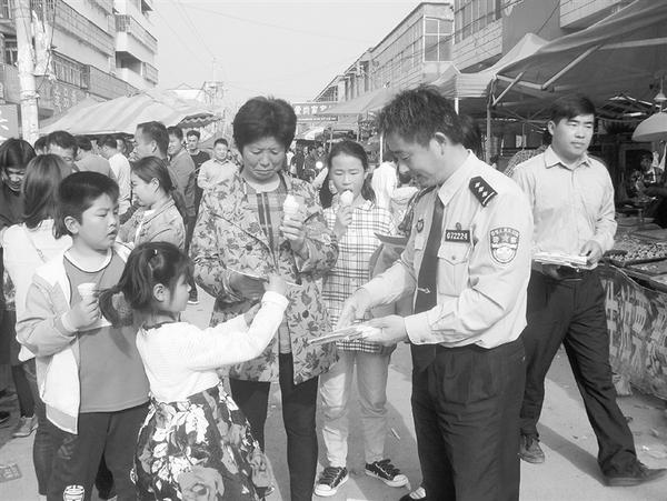 4月9日,商水县魏集镇人大代表活动联络小组联合商水县公安局魏集镇派出所组织民警利用传统集会,向群众和商家发放法律知识宣传单,开展扫黑除恶宣传活动。图为魏集镇人大代表、魏集镇派出所指导员朱玉森向群众发放宣传单。
