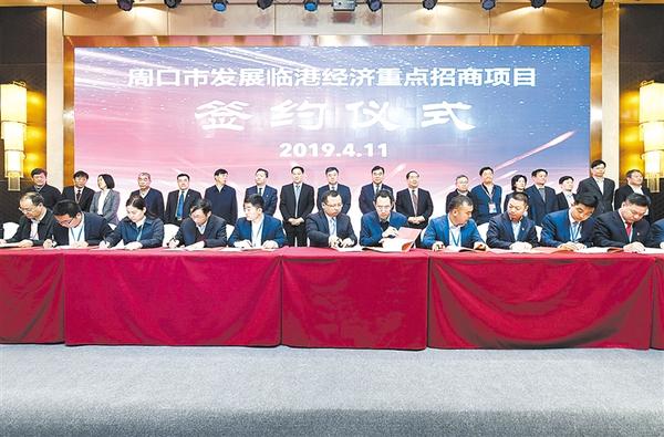 本报讯 (记者 刘彦章 李凤霞 宋风 ) 4月11日,在2019临港经济高质量发展论坛周口市发展临港经济重点招商项目签约仪式现场,全市共有38个项目签约,总投资532.28亿元,签约企业普遍看好周口区位优势。