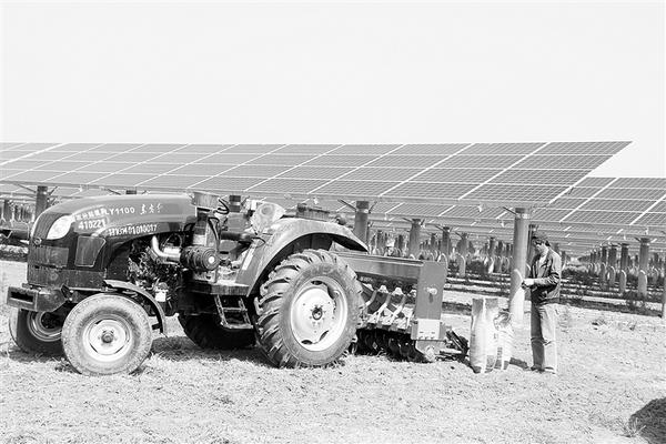 商水县积极开展农村能源革命试点工作,在谭庄、张明、郝岗等乡镇引进占地3000多亩的光伏发电产业项目,采取光伏与农业复合经营思路,上部空间发电,下部空间发展种植业,实现“一光多照,一地多收”高效化利用。图为4月17日农机手在郝岗镇消停村的光伏产业扶贫基地中播种花生。记者 付永奇 通讯员 吕耀光 摄