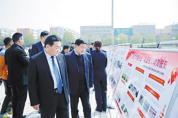 4月10日,为检验脱贫攻坚成效,太康县在县人民广场举行脱贫成果及工作业绩集中展示活动。图为太康县委书记王国玺、县长李锡勇等县四个班子领导在现场参观。