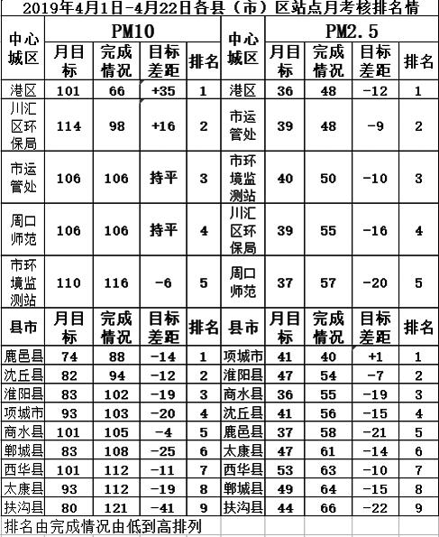 2019年4月1日至4月22日各县市区站点月考核排名情况