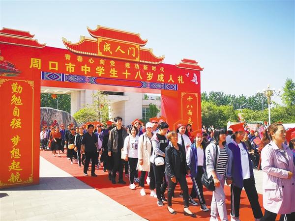 本报讯 (记者 王珂 文/图) 姹紫嫣红春日暖,良辰美景贺青年。4月18日,由共青团周口市委联合市委政法委、市关工委、市教体局、市城乡一体化示范区举办的“青春心向党,建功新时代”周口市中学生十八岁成人礼在周口市文昌中学举行。
