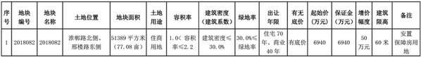 备注:①具体建设方案须报规划部门批准后实施,土地出让合同签订后,12个月内必须开工建设,工期30个月,土地成交价款需在土地出让合同签订后60日内缴清,交地时间6个月内。②2018082号宗地用地性质:二类居住用地(R2)(安置保障房用地),2018082号宗地可兼容商业建筑面积比例不大于15%;。③海绵城市规划要求:2018082号宗地下沉式绿地率不低于60%,透水铺装率不低于80%;具体以规划部门出具的规划指标为准,详见《规划条件通知书》。