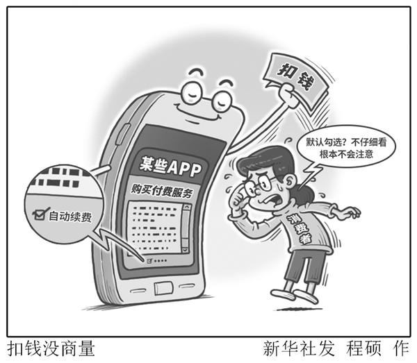 今年1月1日起正式实施的电子商务法规定,电子商务经营者搭售商品或者服务,应当以显著方式提请消费者注意,不得将搭售商品或者服务作为默认同意的选项。然而,“新华视点”记者调查发现,不少APP在用户购买服务时,对于自动续费没有明确提示,有的甚至默认勾选。当用户想要取消自动续费时困难重重,有的APP上甚至找不到任何取消订购的提示。