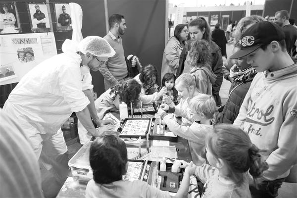 4月27日,在比利时布鲁塞尔,小朋友们在布鲁塞尔科技节上参加化学工作坊。