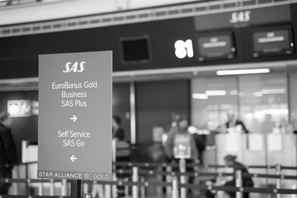 5月3日,在瑞典斯德哥尔摩阿兰达机场,乘客在北欧航空公司柜台办理乘机手续。