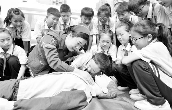 5月8日,在邯郸市邯山区桃源小学,邯郸市明仁医院的医护人员向学生传授心肺复苏急救知识。