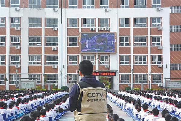4月27日,中央电视台走进项城市宏林学校,专题采访创新型课堂体系建设。图为央视记者正在拍摄学校大课间活动。记者 杨光林 通讯员 朱耀廷 摄