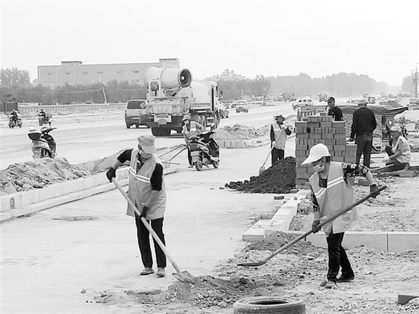 我市重点工程项目港口物流产业集聚区颍东路至后寨段建设已接近尾声。目前,机动车路面建设已全部完成,非机动车道和人行道正在加紧收官。图为施工人员在修整道路辅道和边角。