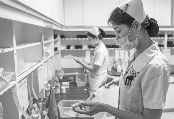 5月12日,在岗位展技能竞赛中,河北省枣强县人民医院的护士在进行医疗药物配液。