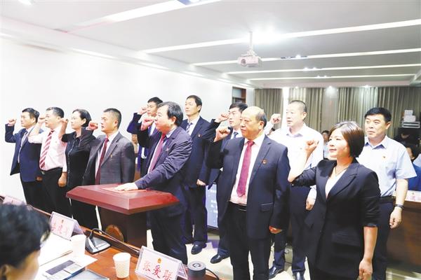 会上,陈强等被任命人员先后进行宪法宣誓(如图),李建军向被任命人员颁发任命证书。王洪彬作关于提请任命顾家富等150名人民陪审员的报告及情况说明,并获大会表决通过。