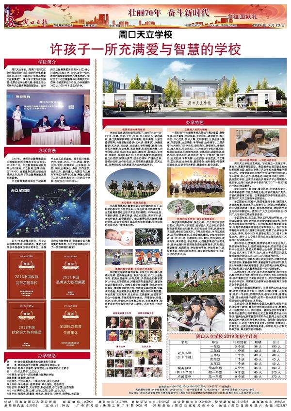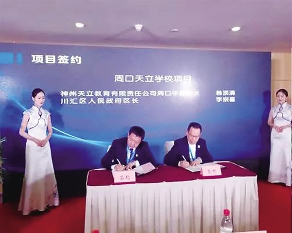 周口天立学校,是周口市川汇区政府通过招商引资打造的河南省级重点项目,是川汇区政府与“中国品牌实力教育集团”、清北学子重点成长摇篮、世界名校学生孵化器、香港上市公司神州天立教育集团强强联合,由神州天立教育集团斥巨资(4.5亿)精心打造的,实施小学、初中、高中一体化教育的高端寄宿制民办精英学校。学校位于川汇区健康路与太清路交叉口西南,占地面积近200亩,办学规模约3800人,2019年9月正式开学。