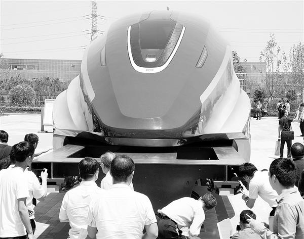 5月23日,人们在时速600公里高速磁浮试验样车下线仪式上参观。