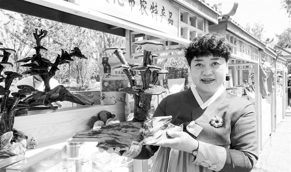 5月23日,一位来自吉林省延边的妇女在展示当地产的灵芝。