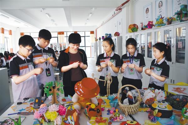 在推进素质教育过程中,沈丘县多所中小学开设剪纸、书法、绘画、音乐等校本课程,提高学生的动手能力、创新能力。图为思源实验学校老师在美术课上教学生做手工。