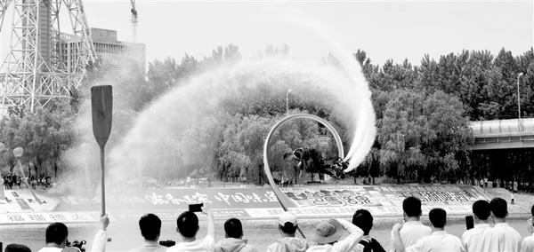 水上飞行器表演是观赏性较高的水上表演之一,俗称水上“钢铁侠”,是一项由外国人发明的水上摩托表演项目,两人一组,一人驾驶摩托艇,一人在水面表演。飞行器的动力主要来自于摩托艇,靠一根水管连接在摩托艇的喷射口,通过摩托艇的喷射动力把人冲起来,最高能达到10米。表演者要在空中完成各种花样动作,这对表演者的平衡及身体协调能力要求很高。