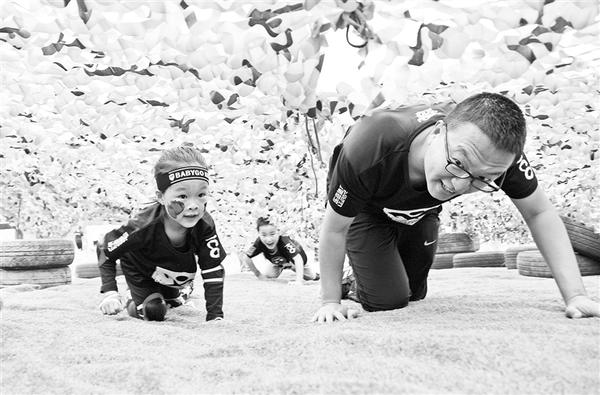 5月30日,在山东省烟台市芝罘区宝威幼儿园举行的迎“六一”儿童定向障碍竞速赛中,家长与孩子合力完成挑战。
