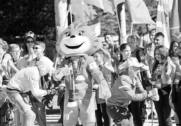 5月29日,“足球·友谊”儿童足球项目吉祥物在开幕式现场。当日,来自世界各地超过50个国家和地区的数百名少年球员、教练员、裁判员和记者相聚西班牙首都马德里,共同参与2019“足球·友谊”儿童足球项目开幕式。新华社记者 郭求达 摄