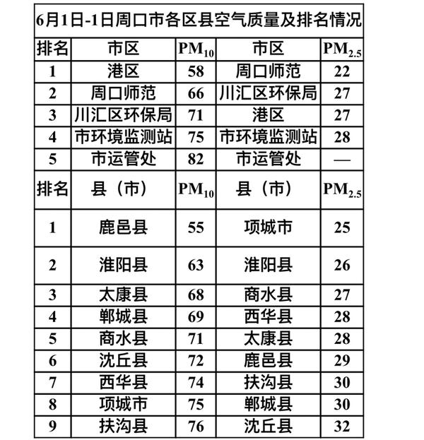 6月1日周口市各区县空气质量及排名情况