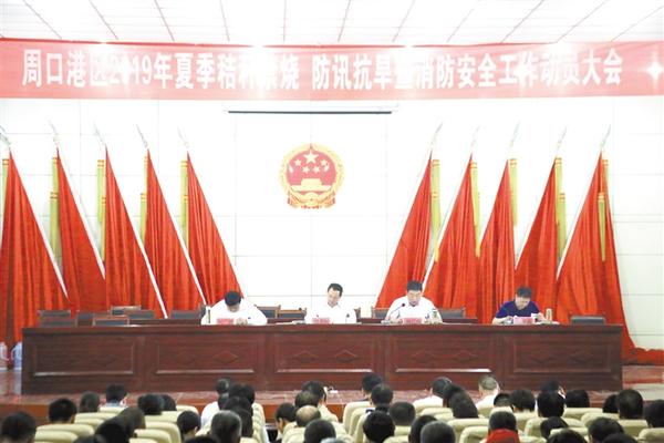 本报讯 (记者 宋风 文/图) 5月24下午,周口港区召开2019年三夏生产、秸秆禁烧、防汛抗旱工作动员大会暨消防安全工作会议(如图)。区管委会主任程若光对各项工作进行了安排部署,并提出了具体要求。区纪委书记尚红伟、区党委委员杜广贤、区公安分局局长何学民出席会议。