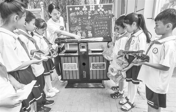 6月4日,安头屯中心小学老师指导同学们进行垃圾分类。当日,河北省香河县安头屯中心小学开展教育活动,引导同学们爱护环境,培养环保意识。新华社发