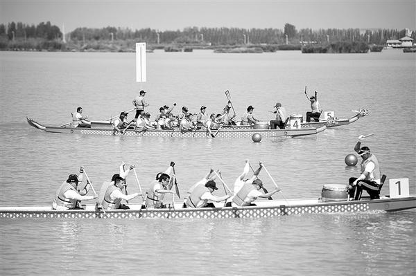 6月5日,参赛龙舟队在银川阅海湖上竞逐。