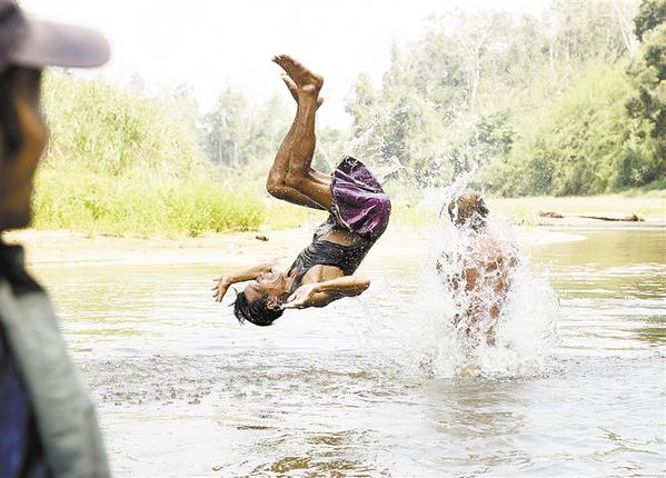在缅甸北部实皆省,很多居民傍水而居,与自然和谐相处,依然保持着传统的生活方式。这是在缅甸北部实皆省的大麦地野生动物保护区,当地人在钦敦江支流的水中玩耍。新华社发