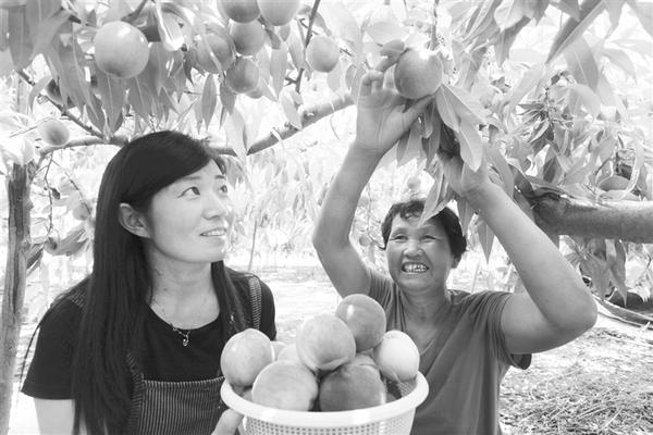 6月9日,游客在商水县东城办事处王沟桥村生态桃园合作社内采摘鲜桃。近年来,该县工商联利用当地良好的生态优势,积极引导返乡农民工成立合作社,发展生态种植业,种植桃、草莓、葡萄等,亩均效益达2万余元,成为当地农民脱贫致富的新途径。