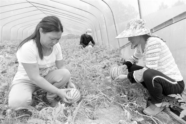 6月10日,在江西省永新县莲洲乡土田村,瓜农在洪水退去后进入瓜棚采摘西瓜。当日,江西省吉安市永新县境内开始停雨转阴。由于之前强降雨导致的洪涝灾害毁了不少农田及作物,目前永新县各乡镇正积极组织开展灾后自救。新华社发