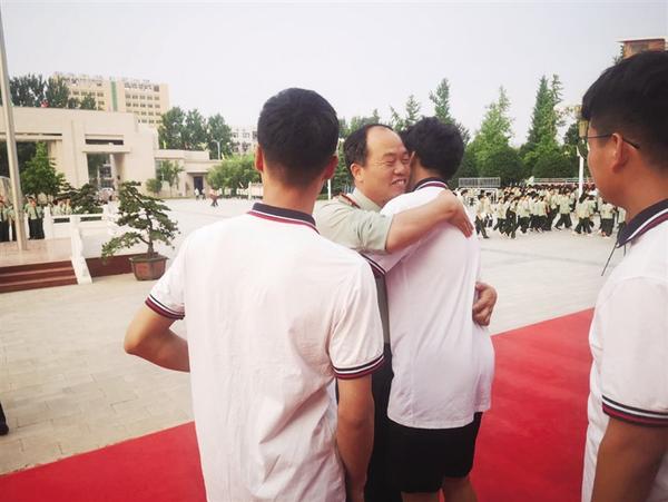 6月10日6时许,全校师生齐聚校园,为高三毕业生举行高中生涯最后一次升旗仪式。图为学生与校长朱贵华道别离、致珍重。