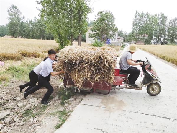 鹿邑农商银行生铁冢支行党员先锋队在“双百”大走访途中帮助田间农民。冯健 摄