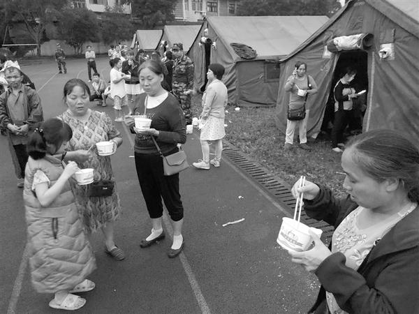 6月18日,在长宁县双河镇中学操场,群众吃上热粥。新华社发
